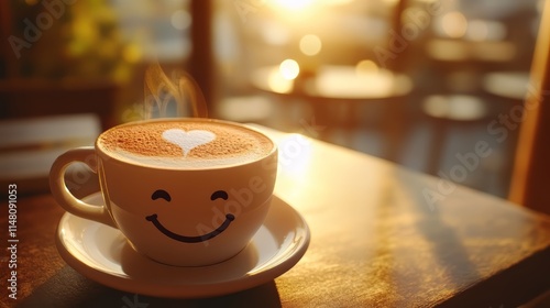 latte, hot drink, cappuccino, cup, mug, cafes, cafes, eatery, barista, nubes, smiley face, happy, cheerful, positive, morning, sunlight, sun, golden hour, warm, cosy, steam, hot drink, beverage, delicious, tasty, aroma, relaxing, romantic, love, art, design, drawing, foam, milk, espresso, brown, white, wooden table, background, blurry, bokeh, indoor, window, view, ambience, atmosphere, feeling, emotion, mood