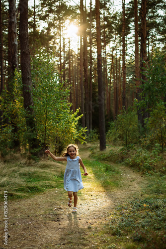 Happy little girl running on a forest path with golden sunlight streaming through tall trees for childhood freedom concept