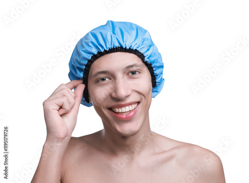 accessory, adult, background, bathe, bathroom, blue, cap, care, caucasian, clean, closeup, colours, dry, equipment, fabric, hair, happy, hat, head, hotel, hygiene, isolated, lifestyle, male, man, modern, naked, person, portrait, protect, protection, protective, routine, shower, smiling, spa, stylish, laundered, washing, water, waterproof, wear, wearing, wellness, wet, white, young