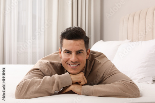 adult, alone, apartment, background, bed, bedding, bedchamber, calm, care, caucasian, comfort, comfortable, cosy, domestic, dream, early, photogenic, happy, health, healthy, home, house, indoor, lazy, leisure, lifestyle, lying, male, man, morning, person, portrait, relax, rest, smiling, weekend, wellness