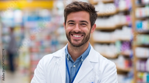 Happy man pharmacist wearing blue shirt white coat smiling. Shelves medicines in pharmacy background. Pro medical worker in drugstore. Health care, medicine, pharmaceutics concept.