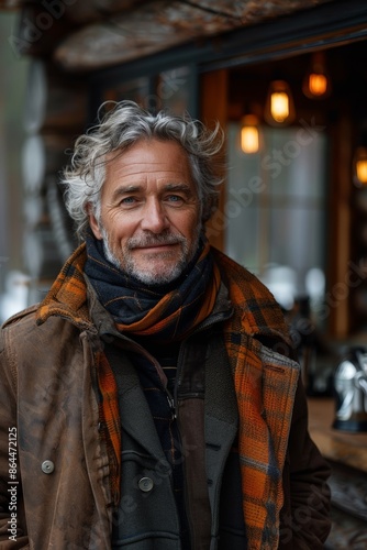 man, mature, happy, smiling, portrait, weekend, outdoors, grey, hair, beard, brown, jacket, foulard, standing, casual attire, relaxed, confident, friendly, positive, expression, emotion, lifestyle, people, adult, male, caucasian, fashion, clothing, outerwear, accessory, model, photo, street, city, urban, daylight, natural, light, background, bokeh, sharpened, colours, high, fidelity