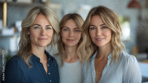 Happy mature middle-aged professional business women bank staff or human resources managers, company executives looking at work, blue inch shirt, white, black, blue color scheme, white office backgrou