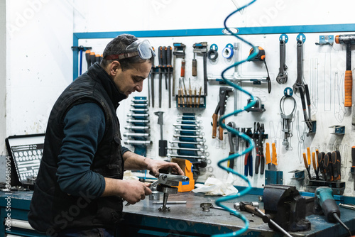 Happy mechanic working. Maintenance of damaged parts in the garage. Maintenance repairs. Repair service concept.