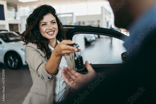Happy middle age businessman buying new and expensive car. Beautiful female dealer gives him vehicle keys.