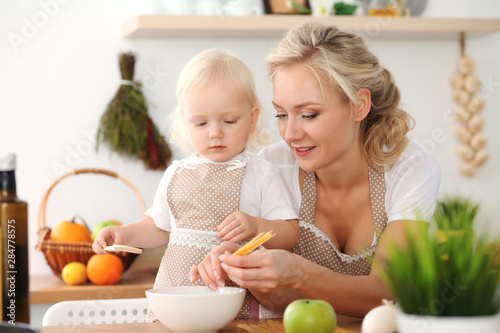 Happy mother and little daughter cooking in kitchen. Spending time all together, family fun concept
