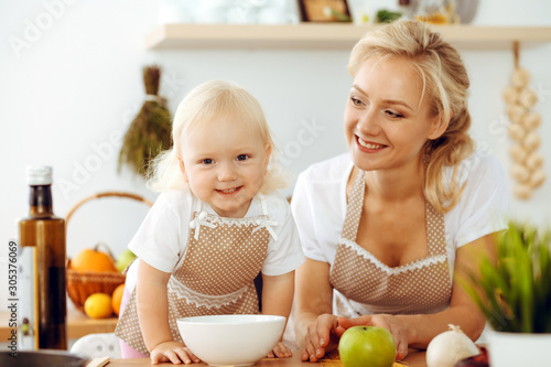 Happy mother and little daughter cooking in kitchen. Spending time all together, family fun concept