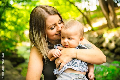 Happy mother having fun with his baby son on the park