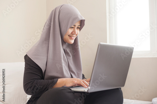 asian, muslim, bed, bedchamber, indonesian, malaysian, arab, computer, wireless, cyberspace, laptop, woman, indoor, working, technology, beautiful, female, home, notebook, young, interior, room, lying, beauty, using, adult, girl, sitting, happy, lifestyle, smiling, relaxation, web, people, joyful, casual attire, happiness, relaxed, house, pretty, attractive, reading, cheerful, person, business, communication, comfortable, success