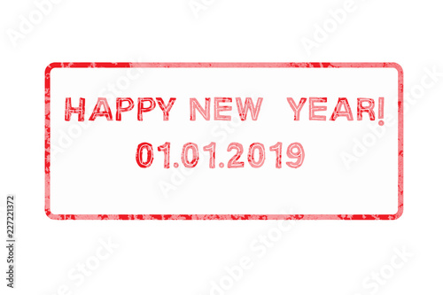 Happy new year 2019 festive postage stamp isolated on white background. Winter holiday illustration with red ink
