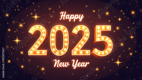 2025, new year, happy new year, celebration, party, holiday, light, glowing, bulb, vintage, retro, design, background, dark, night, sparkle, gold, orange, year, future, event, festive, greeting, card, banner, poster, illustration, graphic, digital, abstract, decoration, symbol, typography, text, wishes, joy, hope, success, countdown, midnight, fireworks, champaign, confetti, festival