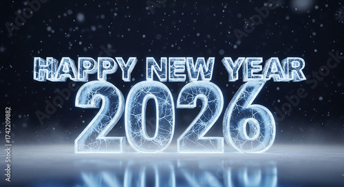 happy new year, 2026, new year, celebration, holiday, winter, snow, ice, glacé, crystal, glow, light, bright, sparkle, festive, greeting, event, future, countdown, midnight, party, abstract, background, dark, blue, illuminated, number, year, season