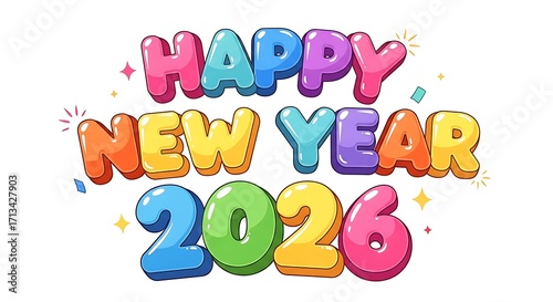 Happy new year cartoon illustration with colorful bubble letters and the year two thousand twenty six