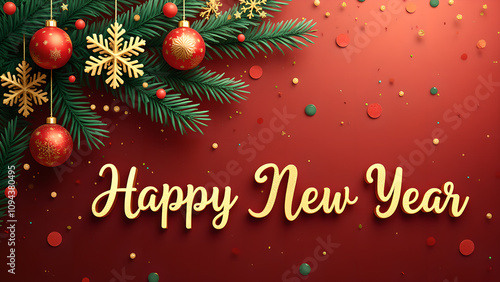 happy new year, new year, greeting, card, celebration, holiday, christmas, tree, branch, ornament, red, gold, green, snowflake, confetti, background, festive, seasonal, winter, december, jan, holiday season, new year's eve, new year's day, wishes, hope, resolution, party