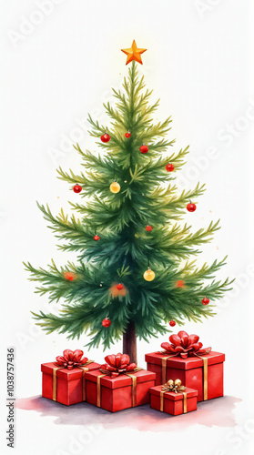 happy, new, year, illustration, feature, christmas, tree, red, gift, box, beautiful, watercolor, style, stock, clip, art, design, element