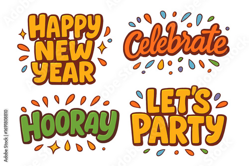 happy new year, celebrate, party, lettering, set, typography, collection, hooray, sticker, cartoon, vector, illustration, text, fun, festive, holiday, greeting, new, year, confetti, design, element, graphic, card, banner, poster, isolated, comic, doodle, cute, colourful, type, font, word, invitation, print, decoration, joy, happy, winter, season