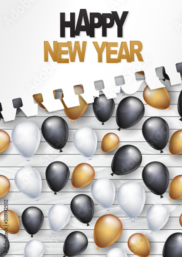 Happy New Year poster or flyer. Winter holiday promotion design with golden, black, and white balloons on white wooden background under torn out sheet of paper. Vector illustration.