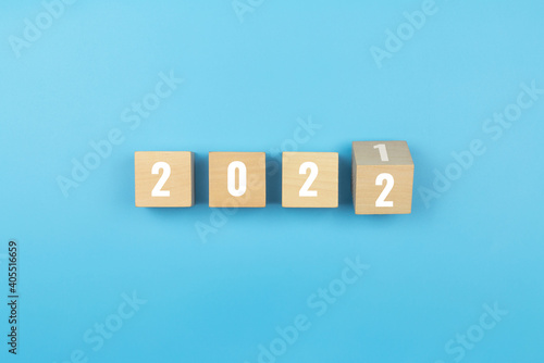 Happy new year. Wooden cube with the number 2021 to 2022 on blue background