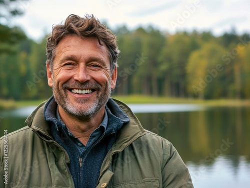 man, outdoors, nature, happiness, lake, forest, smiling, pleasure, recreation, park, beautiful, male, jacket, outfit, seasonal, autumn, joy, warmth, leisure, relaxation, green, blue, peaceful, calmness, enjoyment, hike, camping, trekking, photo, picnic