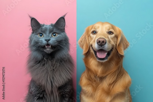 Happy panting Golden retriever dog and blue Maine Coon cat looking at camera, Isolated on color , ai