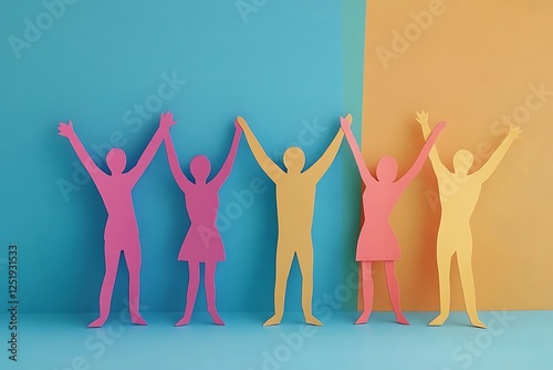 teamwork, oneness, togetherness, collaboration, community, support, empowerment, celebration, success, achievement, friendship, solidarity, group, people, figure, paper, cut-out, silhouette, orange, background, red, vibrant, bright, cheerful, positive, uplifting, optimistic, joyful, happy, woman, pink, yellow, hand, raised, arm, standing, connected, bond, joy, celebratory, together, colourful, illustration, abstract, concept, diversity