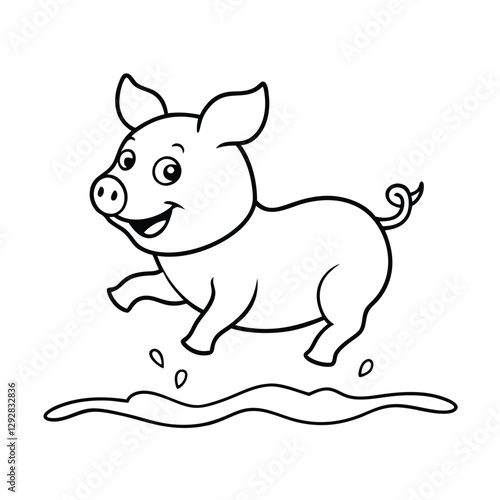Happy Piglet Jumping in Puddle, Cartoon, Line Art, Coloring Page, Farm Animal, Childrens Book Illust