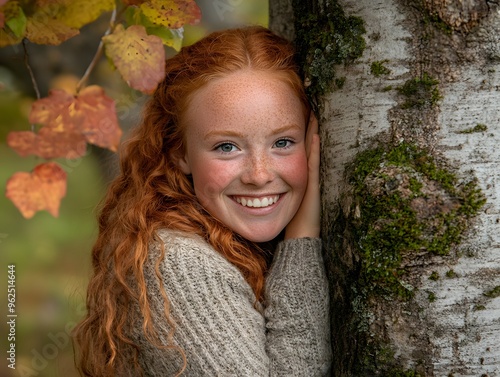 Happy Redhead Girl Leaning Against Birch Tree in Autumn Forest