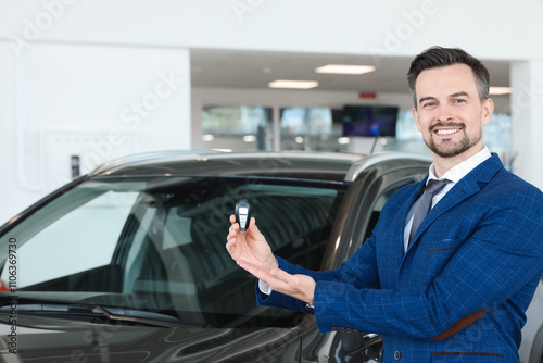 Happy salesman holding key near new black car in salon