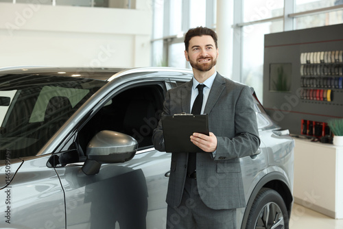 Happy salesman with clipboard near new car in salon