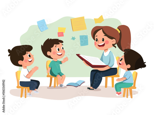 teacher, classroom, children, school, vector, cartoon, education, flat, illustration, joyful, kindergarten, young, concept, character, person, people, woman, female, isolated, happy, standing, pupil, waving, together, friends, learner, cheerful, friendship, lesson, childhood, adorable, educator, funny, pretty, backpack, student, cute, preschool, class, boy, group, girl, fun, children, smiling, happiness, children, clip art, drawing