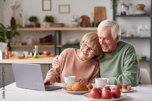 Happy senior couple embracing while sitting at the table and watching movie on laptop online in the kitchen