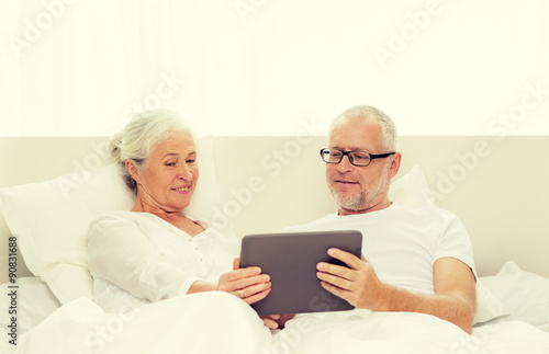 happy senior couple with tablet pc at home