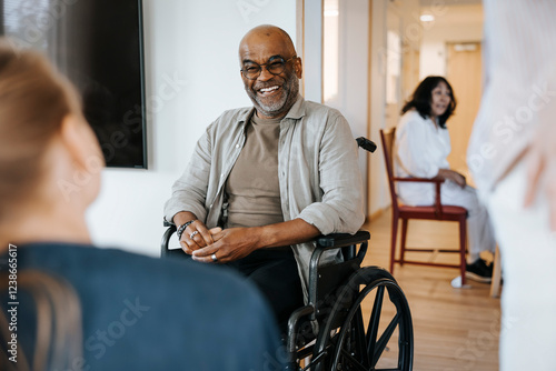 Happy senior man sitting in wheelchair and talking with female caregiver at nursing home