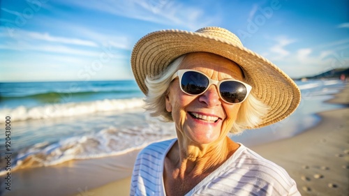 senior, woman, female, happy, smiling, sunglasses, hat, beach, ocean, sea, wave, summer, vacation, travel, holiday, retirement, relax, carefree, joy, happiness, sunshine, blue, sky, sand, beautiful, portrait, closeup, outdoors, lifestyle, elderly, mature, active, healthy, energy, vitality