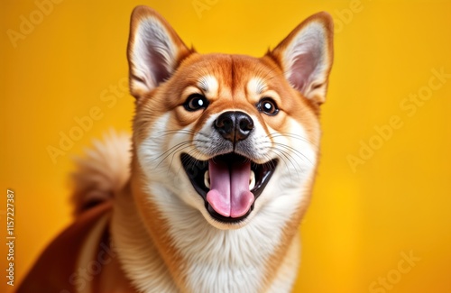 Happy shiba inu dog smiles broadly against bright yellow background. Cute playful pet shows joyful expression. Studio shot captures cheerful domestic animal. Adorable dog breed portrait perfect for