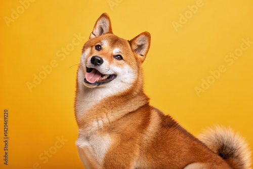 shiba inu, dog, smiling, happy, yellow, background, pet, cute, cheerful, playful, animal, canino, indoor, breed, companion, furry, expressive, bright, portrait, isolated, joyful, nature, loyalty, love, friendly, fun, recognition, lover, lover, enjoyment, marvellously, personality, colourful, sunny, small, popular, adorable, generative, ai