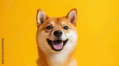 Happy shiba inu on yellow background