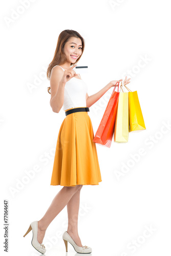 asian, vietnamese, woman, isolated, shopping, consumerism, card, credit, sale, paper bag, beautiful, happy, purchase, full-length, shopaholic, bright, discount, showing, fashion, girl, charming, enjoy, look, plastic, shopper