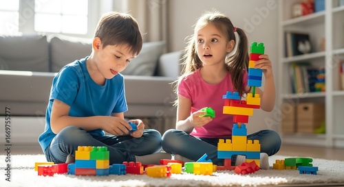 children, children, boy, girl, brother, sister, sibling, family, childhood, youth, kindergartner, person, people, friends, friendship, togetherness, playing, building, constructing, creating, learning, developing, sharing, sitting, enjoying, smiling, happy, block, toy, constructor, plastic, colourful, tower, structure, game, brick, home, house, room, living, floor, carpet, indoor, domestic, sunny, bright, light, background, lifestyle