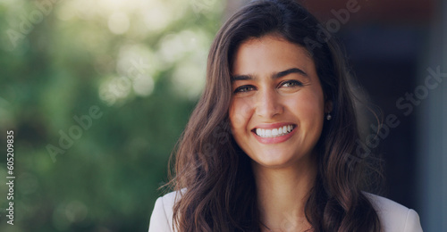 Happy, smile and portrait of business woman in city for mockup space, professional and happiness. New York, career and natural with face of employee in outdoor for motivation, confident and pride