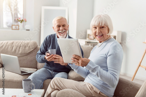 Happy smile. Beaming elderly woman wearing blouse smiling bright while showing pictures on the gadget
