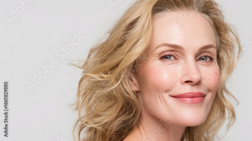 happy, smiling, attractive, 50s, middle-aged, blond, woman, looking, camera, advertising, face, skin, treatment, cosmetic, isolated, white background, closeup, portrait, beauty, mature, skincare, beauty care, rejuvenation, pampering, lifestyle, wellness, well-being, radiant, youthful, confidence, beauty product, natural beauty, elegance, femininity, promotional, happiness, glow, rejuvenate, mature woman