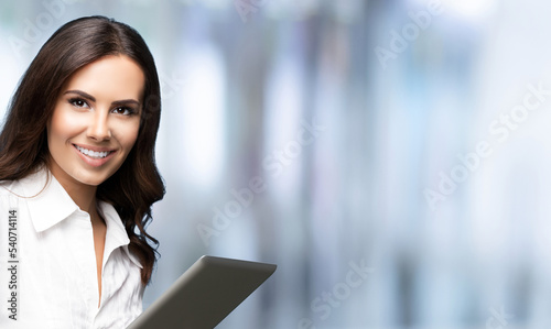 Happy smiling beautiful young brunette businesswoman using no-name tablet pc, against blurred office background, with copy space area for text. Success in business concept.