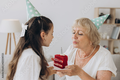 Happy smiling grandmother receives birthday greetings from granddaughter, little girl and senior woman blow out candle on cake and celebrate birthday together.
