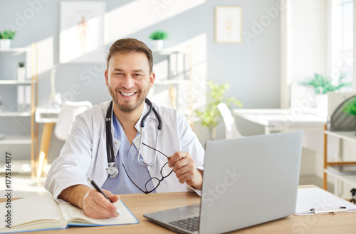 Happy smiling male doctor corporate portrait at desk, cardiologist wearing stethoscope, looking at camera, welcoming for regular examination checkup meeting, visiting disease prevention in clinic