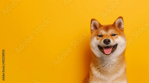 Happy smiling shiba inu dog isolated on yellow orange background with copy space. Red-haired Japanese dog smile portrait