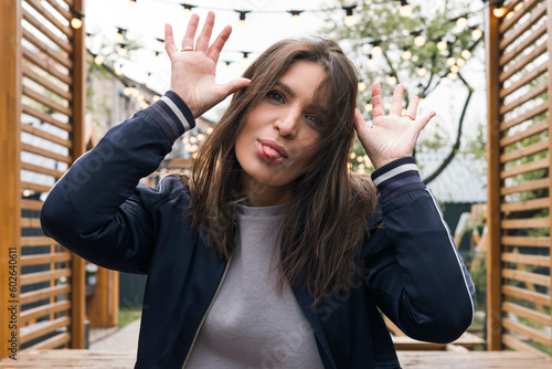 Happy smiling Young brunette girl in casual sport suit clothing and loose hair outdoor on the street, making funny face.