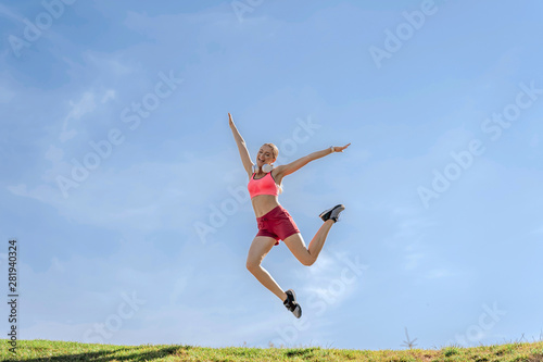 athletic, sportive, training, full-length, concept, woman, physical exercise, fitness, female, sport, practice, health, care, girl, young, lady, smile, happy, enjoy, technology, music, earphones, joyful, sunshine, sunny, red, sky