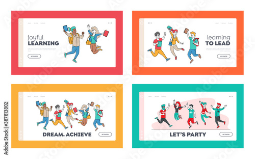 Happy Students Characters Jumping Landing Page Template Set. Schoolboys or Schoolgirls Laughing, Waving Hands, School