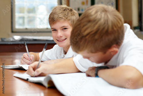 Happy students, classroom and writing in books for education, thinking mindset or children on scholarship. Boys, school kids or learning with creative idea on desk, studying and reading work in class